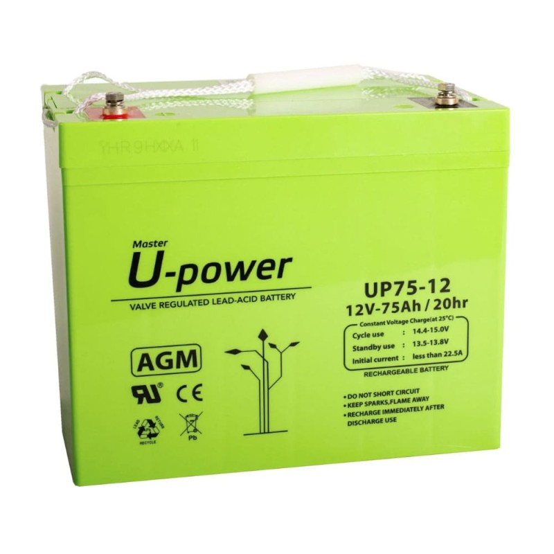 Baterías de ciclo profundo UP75-12 12 v de tecnología AGM avanzado y fibra mejorada están diseñadas especialmente para descargas prolongadas en aplicaciones móviles o fijas con consumos eléctricos. La batería de AGM UP75-12 de 75 Ah monoblock compacta y de fácil instalación, fabricada especialmente para pequeñas instalaciones que requieren de una batería que pueda cargase y descargarse de una forma fiable. Esta batería Ofrece una larga vida en ciclos completos de carga y descarga y es capaz de recargarse por completo en un corto periodo de tiempo